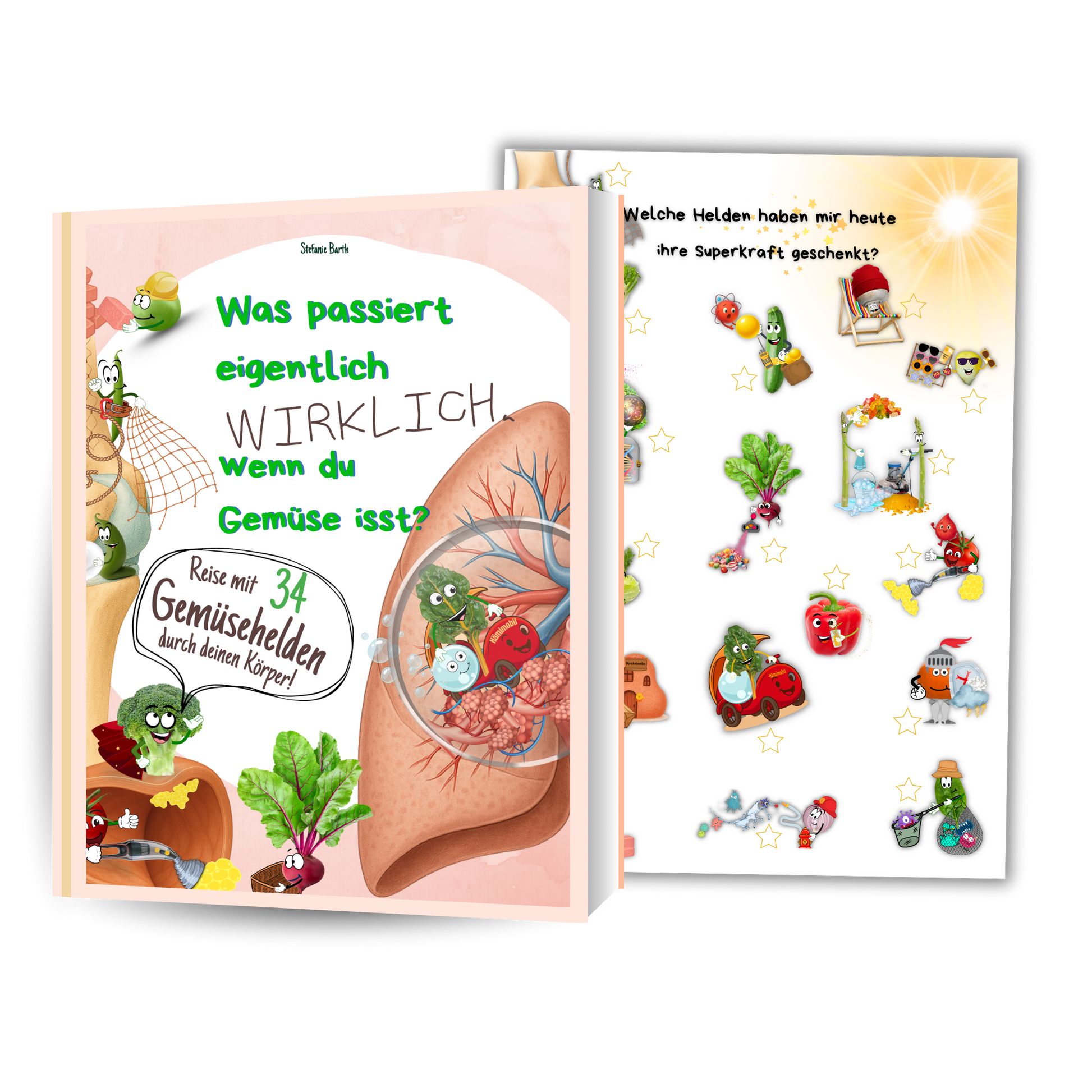 Erstmalig zeigt ein Kinderbuch, was die Nährstoffe – im Buch liebevoll Superkräfte genannt – der jeweiligen Gemüsehelden tatsächlich nach dem Essen im Körper tun.